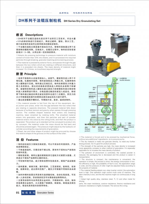 DH系列干法輥壓造粒機(jī)是采用干法擠壓技術(shù), 對(duì)含水量<2%的粉狀物進(jìn)行壓縮成片, 再經(jīng)過(guò)破碎、 整粒、 篩分工藝, 使片塊狀物料變成符合使用要求的顆粒狀物料。
